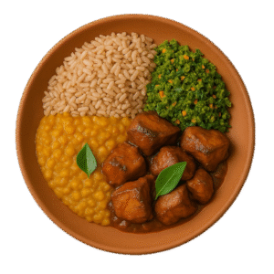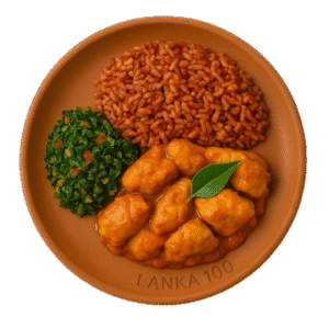 A traditional Sri Lankan vegetarian plate featuring smoky wambatu moju, wholesome red rice, and comforting dhal curry.